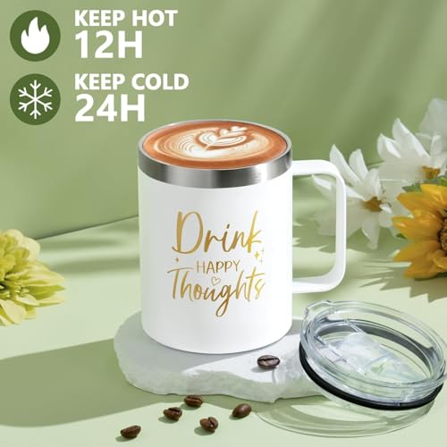 INSULATED TUMBLER WITH HANDLE: Show your love and care with 12oz insulated tumbler in this self care gifts best friend birthday gifts for women, made from 18/8 stainless steel with double-walled vacuum insulation to keep beverages icy cold for 9 hours or piping hot for 3 hours. Perfect for iced coffee, tea, wine, juice, champagne, etc. The heartfelt “Drink Happy Thoughts” message makes it a meaningful gesture for anyone you cherish- ideal as motivational encouragement sunflower gifts for women
