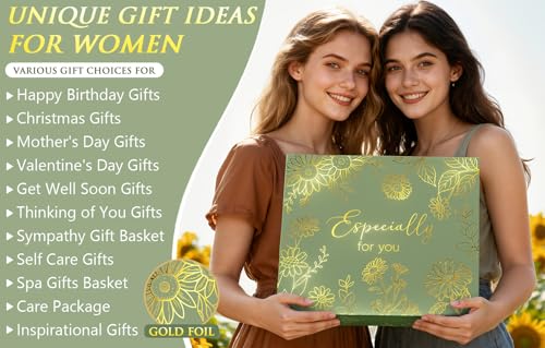 LUXURY GIFTS FOR WOMEN: Elevate the gifting experience with our elegantly crafted gift box, featuring gold-foil sunflower design that adds a touch of elegance to every occasion. Together with a gift card, this sunflower sending sunshine gifts will be one of the most eye-catching birthday gifts set for women, mom, sister, wife, her, best friends, girlfriend, grandma, boss, coworkers, teachers, nurses, etc. Bring this self care get well soon gifts for women care package to charm and delight her