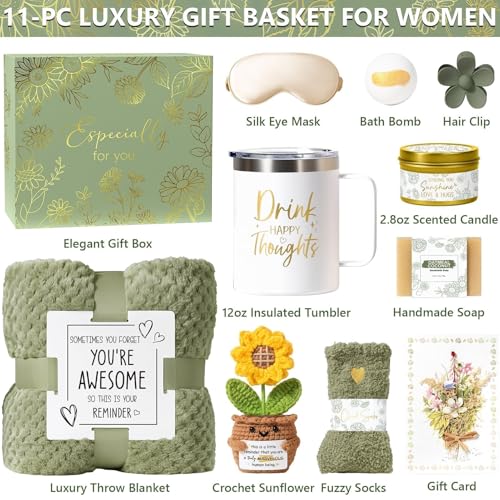 11-PC SELF CARE GIFTS FOR WOMEN: Crafted to surround your loved ones with good vibes, this get well soon gifts for women birthday unique contains carefully selected items to brighten her day: a 39x59in throw blanket, 12oz insulated tumbler with handle, crochet sunflower, 2.8oz scented candle, bath bomb, handmade soap, flower hair clip, fuzzy socks, silk eye mask, gift card & gift box. Such a unique Womens Birthday Gifts, Valentines Day Gifts, Mothers Day Gifts for Mom, Christmas Gifts for Women