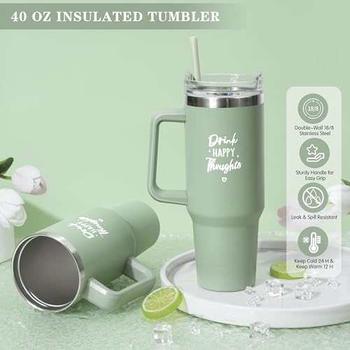 40 OZ INSULATED TUMBLER WITH HANDLE AND STRAW: Crafted from high-quality 18/8 food-grade stainless steel with double-wall vacuum insulation, this reliably maintains your beverage’s temperature. It’s perfect for iced coffee, tea, juice, smoothies, sodaand more. The spiral lid creates an airtight, leak-resistant and spill-proof seal, while the comfortable handle makes it easy to grip and carry wherever she goes. It’s the perfect companion to help her enjoy hydration throughout her busy day.