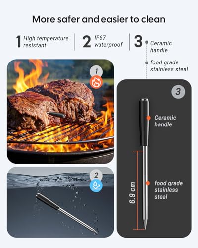 Food-grade Stainless Steel Meat Probe with Alumina Ceramic Handle – The food-grade stainless steel probe resists corrosion and won’t leach harmful chemicals, ensuring your food stays safe and uncontaminated and Easy cleanup appeals to busy cooks.