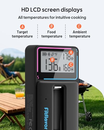 Description NOTE: THIS PRODUCT IS NOT SUITABLE FOR USE IN PRESSURE COOKERS OR MICRO OVENS. The Fitflavor bluetooth wireless meat thermometer is a smart, wireless meat thermometer that supports a stable and efficient connection through Bluetooth 5.4 technology, no worry about signal problems during cooking. It is equipped with a clear HD LCD screen, which displays food internal temperature and ambient temperature in real time, providing a clear overview of the cooking process. Specifications Probe Material: Food-grade stainless steel with alumina ceramic handle Probe Size: φ 5mm Screen Type: HD LCD (0.7 x 1.4 inches) Bluetooth Connectivity: Bluetooth 5.4; 328 wireless range Probe Measurement Range: Food temperature range: 14-212℉ (100℃/212℉ is the ultimate temperature and the highest usable temperature is 96℃/205℉) Ambient temperature range: 32~572℉ Probe Measurement Accuracy:±1.8℉ Probe Response Time: 1 second Temperature Calibration: ±12℉ Probe′s Battery Life: 20 hours Probe′s Charging Time: 30 minutes Base′s Power Source: 2 AAA batteries Base′s Battery Life: 120 hours Package Contents Probe*1 Base*1 AAA Batteries*2 User Manual*1