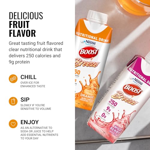 Specification: Boost Breeze Clear Nutritional Drink, 9g Protein, 250 Nutrient-Rich Calories, 2 Flavor Variety Case (Orange + Wildberry), 8 Fl Oz (Pack of 24)