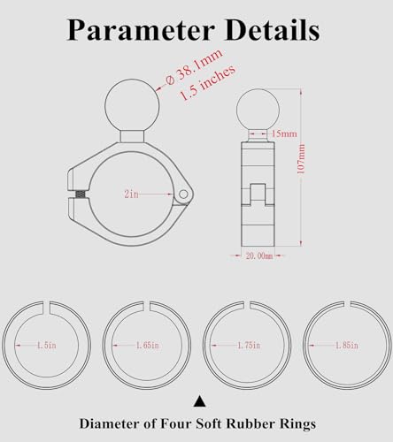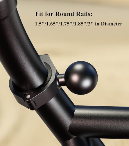 The 1.5 inches ball clamp mount accommodates round rails 1.5 inch (38.1mm) / 1.65 inch (41.91mm) / 1.75 inch (44.45mm) / 1.85 inch (46.99mm) / 2 inch (50.8mm) in diameter. An Allen key is included with the package to facilitate your installation