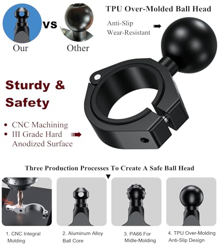 The main body of the 1.5” ball mount is made of 6061-T6 aluminum alloy material with CNC machining and iii grade hard anodized surface for durability and reliability in the most demanding environments. TPU over-molded ball head, non-slip and wear-resistant