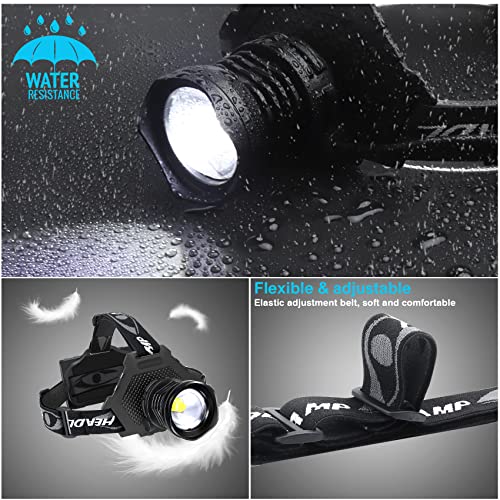 【Zoomable & 5 Lights Modes 】: High lumens headlamps with 5 lighting modes: Strong / Medium / Low / Flash / SOS, Zoomable headlamp to achieve free zoom light, Rechargeable headlamp can emit large area of floodlights or spotlights. It is safe, reliable and easy to use, it is the perfect flashlight for camping, climbing, hiking, hunting, exploring.