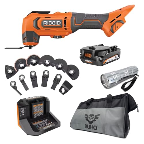 Buho Ridgid 18V Cordless Oscillating Multi-Tool Bundle with 2.0 Ah Battery, Charger, 14-Piece Blade Accessory Kit, Tool Bag & Flashlight