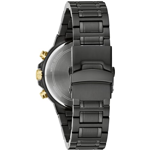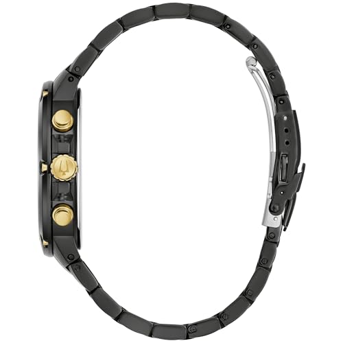 This Bulova men’s 6-hand chronograph is defined by luxurious contemporary design. The black IP-coated stainless steel case is accented with gold-tone elements, including contrasting bolts in the bezel. The matching black dial features radiant brushing with applied gold-tone indices and 8 diamonds marking the hours. The gold-tone hands are filled with luminescent material for low-light legibility and gold-tone accents make it easy to read the subdials that display 24-hour time, running seconds, and the 30-minute chronograph counter. The watch is completed with a matching black IP-coated multi-link bracelet with a fold-over clasp. Live your life with bold style with this Bulova men’s timepiece.