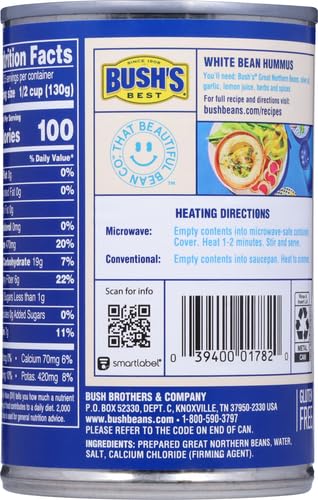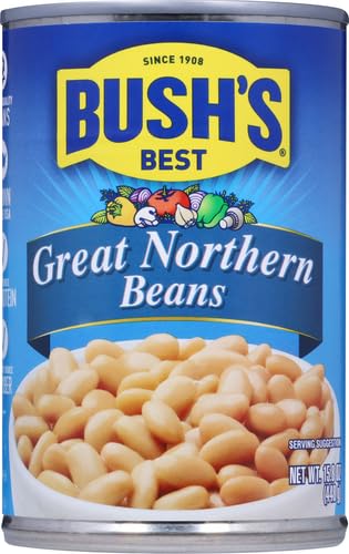 Specification: BUSH’S BEST Canned Great Northern Beans, Source Of Plant Based Protein And Fiber, Low Fat, Gluten Free, 15.8 oz