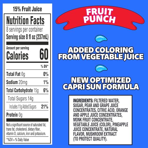 Introducing Capri Sun Fruit Punch Flavored Juice Drink Blend in a convenient multi-serve bottle. Capri Sun brings the taste kids love, now in a large 64-ounce bottle the whole family can enjoy. Each bottle is equal to more than 10 pouches, so you can stock up for at-home convenience. At Capri Sun, we believe in keeping it real — that’s why our juice is made with fruit juice. Made with no artificial dyes, flavors, sweeteners or preservatives, it’s an excellent choice for your family. Perfect for gatherings, parties or family meals, Capri Sun adds a splash of fun to any occasion. Shake well before pouring and refrigerate after opening. Loved by kids and now available for the whole family to enjoy — it’s gonna be epic!