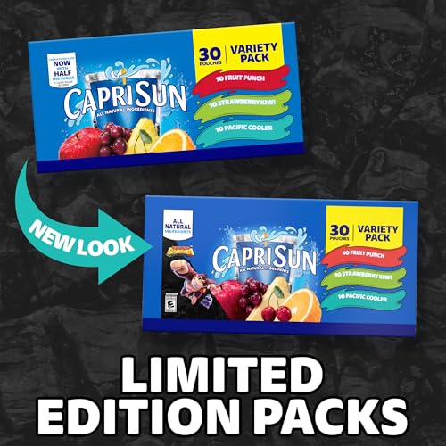 Grab a little juicy freedom with Capri Sun Fruit Punch, Strawberry Kiwi and Pacific Cooler Flavored Juice Drink Blends. Kids will love the taste of our Capri Sun, made with a new and improved formula. Made with the all-natural sweetener, monk fruit, our juice drink blends variety pack features an assortment of fun flavors that are joyfully refreshing. We never add artificial flavors, colors, preservatives or high-fructose corn syrup to our pouches. Our 30 count variety pack contains 10 Fruit Punch, 10 Strawberry Kiwi and 10 Pacific Cooler flavored juices. Each 6 fluid ounce pouch comes with a straw so they’re ready for kids to squeeze and sip. Unleash kids’ independence with a ready-to-drink Capri Sun. Find Pokemon Legends, Donkey Kong Bananza and Mario Kart World on our limited-edition packs — get yours while they last!