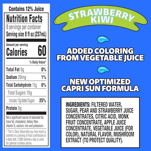 Specification: Capri Sun Strawberry Kiwi Flavored Juice Drink Blend from concentrate with other natural flavors, 64 oz Bottle