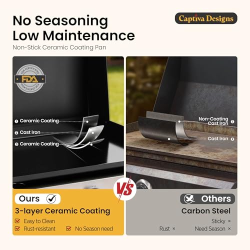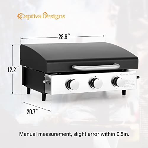 Specification: Captiva Designs 22 in Flat Top Grill with Ceramic Coated Cast Iron Pan, Portable Tabletop Propane Gas Griddle Grill for Camping, Outdoor & Tailgating Barbecue, 24,000 BTU Output, 3 Burners