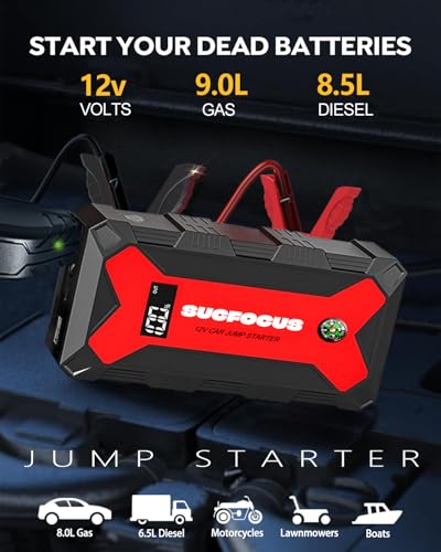 【More Powerful Jump Starter】SUCFOCUS self jump starter battery pack can quickly jump start a dead car battery. Even if the battery voltage is too low, pressing the “RST” button will force the car to restart. With boosted 4000A peak current, the SUCFOCUS car battery jump starter power pack can restart your 12V vehicles (Up to 9.0L gas/7L diesel engines) in seconds with a 45 C high-rate lithium battery. Suitable for cars, trucks, motorcycles, SUV, ATV, UTV, dirt bike, snowmobile, boats, lawnmowers, trailer, RV, tractor and so on. Up to 20 jump starts on a single charge.