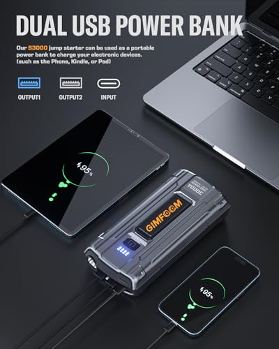 Specification: Car Jump Starter, 3000A Jump Starter Battery Pack for Up to 9.0L Gas or 7.5L Diesel Engine, 12V Car Battery Jump Starter, Jump Box with LED Light, Storage Case, and Dual USB Output.