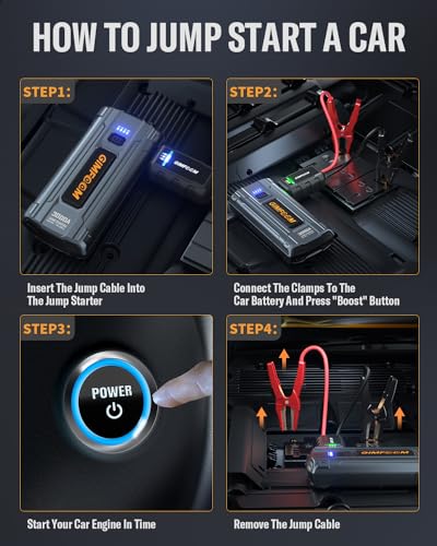 【POWERFUL CAR JUMP STARTER】The car battery jump starter is equipped with 3000A peak current to quickly start low voltage or completely drained car batteries. The jump starter has a 3 times enhanced current compared to the old 2nd generation and can start up to 9.0L gas and 7.5L diesel engines. Suitable for 12V cars, trucks, motorcycles, boats, RV’s or lawnmowers, etc.
