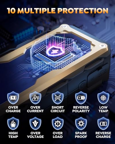 【10 Advanced Safety Features】- Jump start battery pack with 10 intelligent safety protections, from overcharging to reverse polarity, this portable car jump starter provides peace of mind in extreme temperatures (-4°F to 140°F), ensuring safe operation for both beginners and experts.