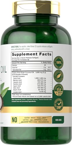 Specification: Carlyle Coconut Oil Extra Virgin Softgel Capsules | 3000mg | 240 Count | Naturally Occurring MCTs | Non-GMO and Gluten Free Supplement