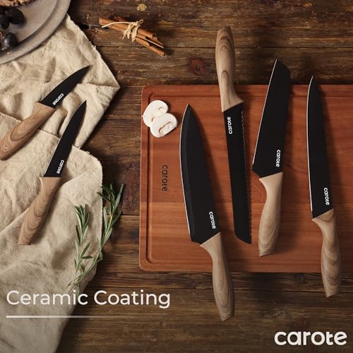 CAROTE 12PCS Knife Set, Stainless Steel Kitchen Knife Set with Nonstick Ceramic Coating Dishwasher Safe with 6 Blade Guards, Rustproof, Black