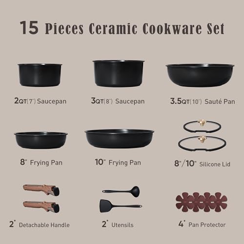 Specification: CAROTE 15Pcs Ceramic Cookware Set, Pots and Pans Set Non stick, Kitchen Cooking Set with Detachable Handle, Non Toxic Induction Cookware, Dishwasher/Oven Safe, PFAS Free, Black&Gold