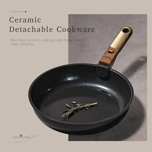 The detachable handle design makes storage easy, saving up to 70% more space, and providing the ultimate convenience for small kitchens or RV essentials. Additionally, the removable handle allows for seamless transitions from stovetop to oven, to table, and is compatible with induction cookware.