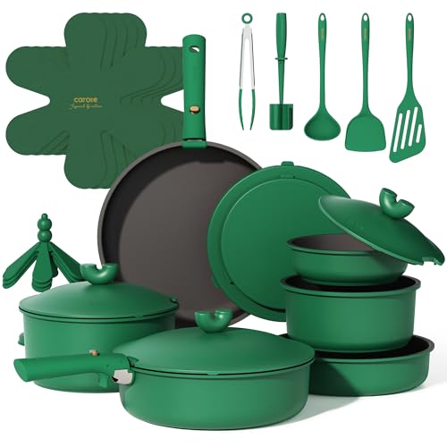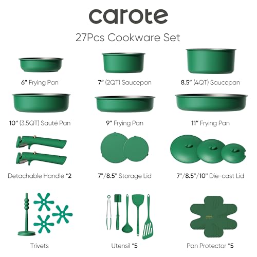 Specification: CAROTE 27pcs Pots and Pans Set Non Stick, Gift Set Nonstick Cookware Die-cast Aluminum Detachable Handle, Dishwasher/Oven Safe, Induction Cooking Pot and Pan Sets, Green, RV Kitchen Cookwares