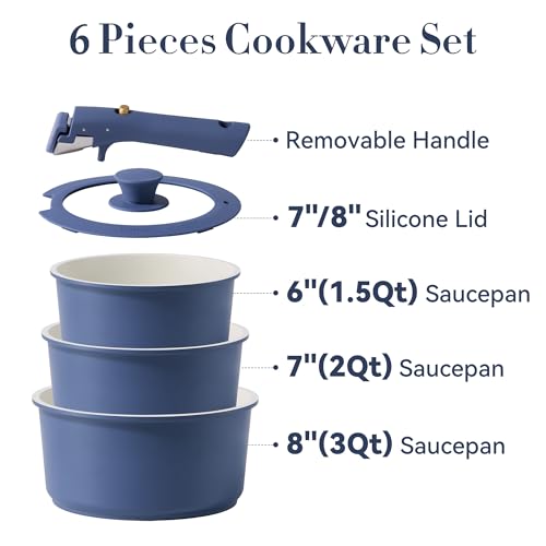 Specification: CAROTE 6pcs Nonstick Sauce Pan Sets with Lid 3 Sizes(1.5QT, 2QT & 3QT), Non Stick Cooking Pot with Detachable Handle, Kitchen Sauce Pots Induction Pot, PFOA FREE, Dishwasher Safe, Blue