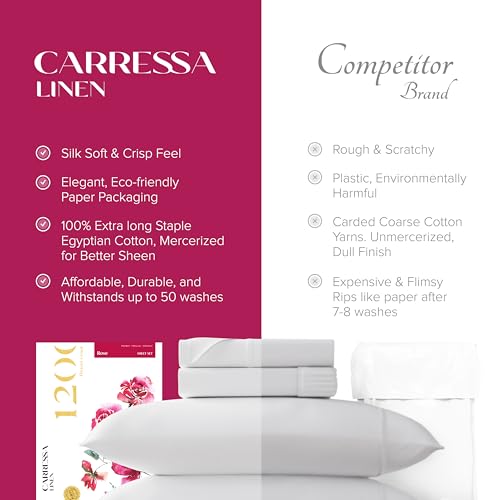 Carressa Linen 100% Egyptian Cotton Queen Sheet Set – Luxury 1200 High Thread Count Egyptian Cotton Sheets Queen Size (4 PC, White), Silky Soft, Cooling, 17″ Deep Pocket Sateen Weave Hotel Bedding