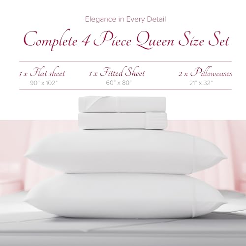 Includes a Complete, Well-Fitting 4 Piece 100% cotton sheets: The Queen Egyptian Cotton Sheet Set includes 4 pieces – 1 flat sheet (90″ x 102″), 1 fitted sheet (60″ x 80″ + 17″), and 2 Standard / Queen size pillowcases (21″ x 32″). The elasticized fitted bedsheet comes with a 17 inch extra deep pocket to easily accommodate regular and tall mattress up to 19 inches. Pillow cases have an open closure so the oversized pillows can easily slip in