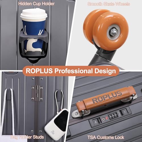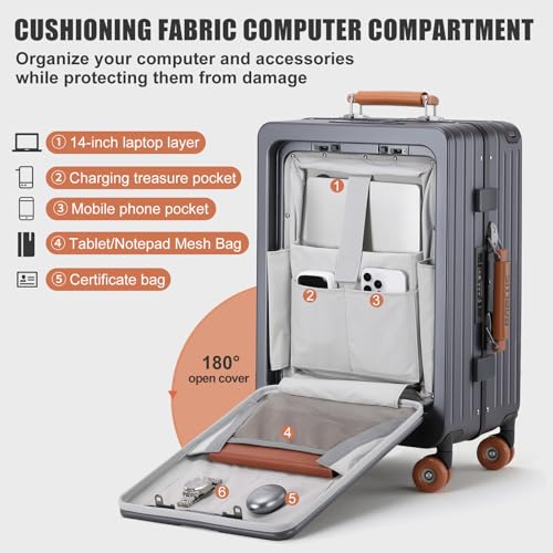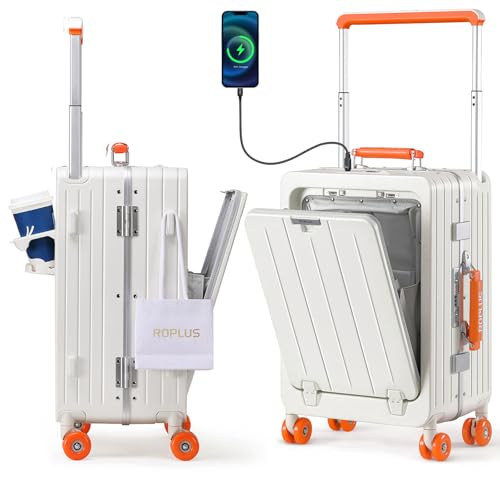 Specification: Carry On Luggage with Front Cover Compartment, Aluminium Frame Rolling Suitcase with Skate Wheels, USB Ports, Cup Holder, TSA Lock(WhiteOrange, 21-Inch)