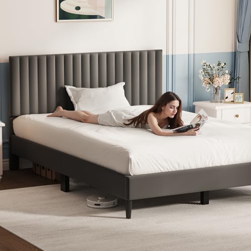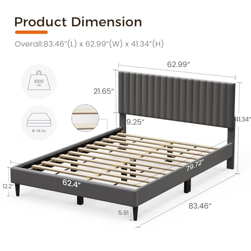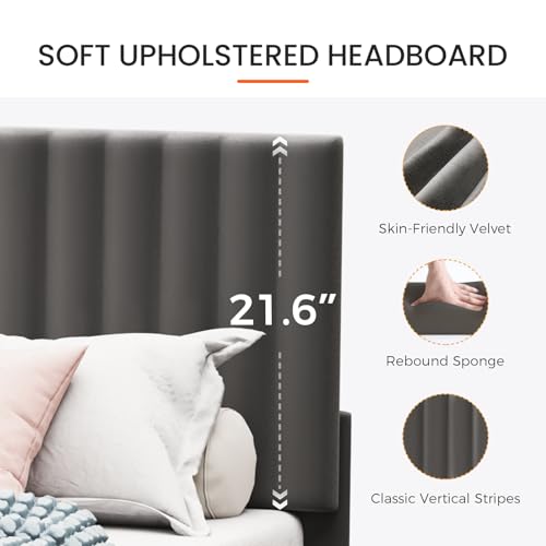 Specification: Casaottima Queen Bed Frame, Velvet Upholstered Platform Bed with Headboard, Strong Wooden Slats Support, Noise-Free Mattress Foundation, No Box Spring Needed, Easy Assembly,Vertical Stripe Smoky Grey