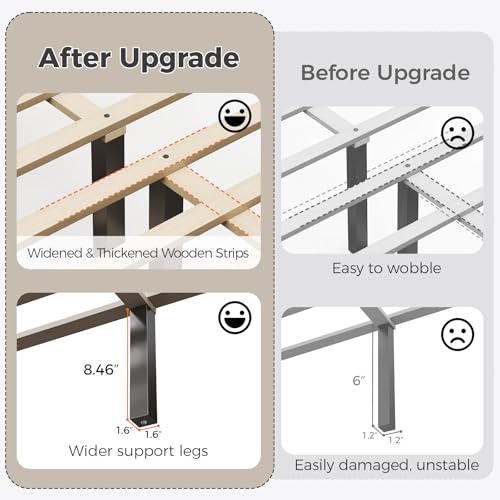 【Fits Standard Queen Mattresses】Designed for queen size mattresses 8–14 inches thick, this platform bed provides firm support with no box spring needed. Compatible with memory foam, hybrid, and latex mattresses.