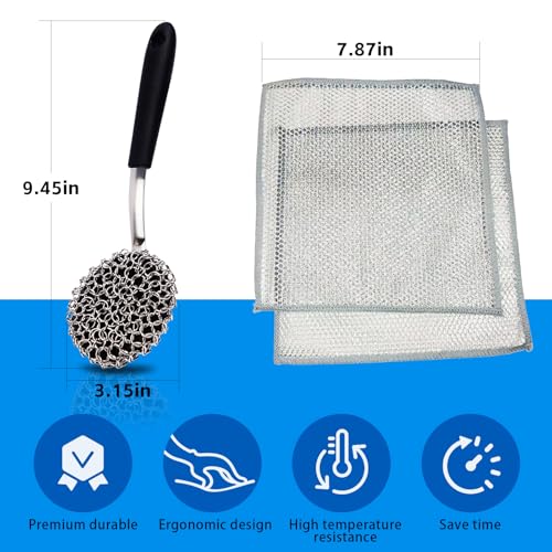 Specification: Cast Iron Scrubber with Silicone Handle, Chainmail Scrubber 316 Stainless Steel Brush Non-Scratch Pot for Cast Iron Pan Skillet Cleaner, Dishwasher Safe