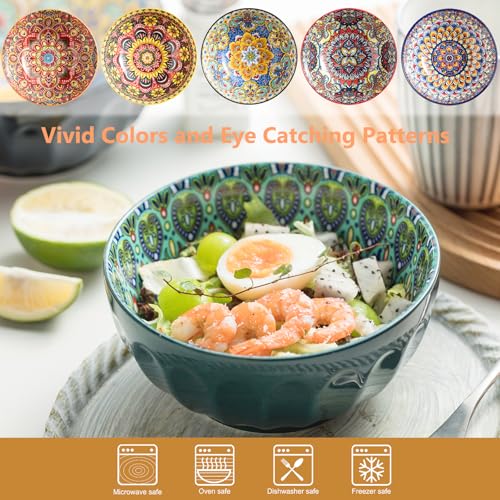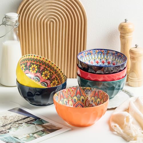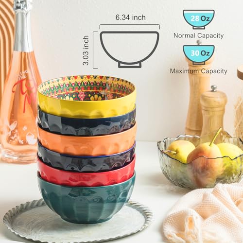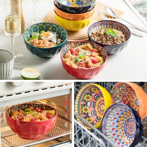 Cereal Bowls Set of 6, Bohemian Soup Bowls, 30 oz Colorful Ceramic Serving Bowls for Kitchen, Breakfast, Boho Decorative Bowl, Microwave Oven Safe Bowl for Salad, Pasta, Oatmeal