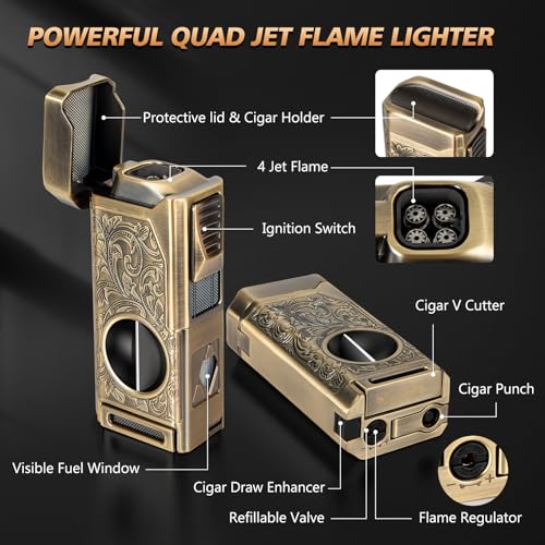 Specification: Cigar Lighter, 4 Jet Flame Torch Lighter, Refillable Butane Lighter with Cigar Cutter V Cut Cigar Punch Cigar Holder Cigar Draw Enhancer, Great Cigar Accessories Cool Lighters for Smoking in Gift Box
