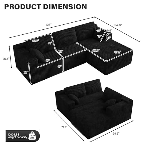 Specification: Cloud Couch Sectional Modular Sofa, 103″ Comfy Black L Shaped Boneless Couches for Living Room, Deep Seat Plush Corduroy Couch Sectional Memory Foam Sofa(Black, Right Facing Chaise)