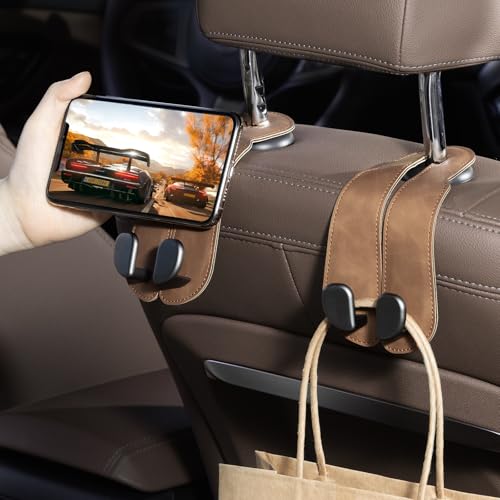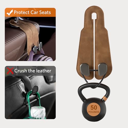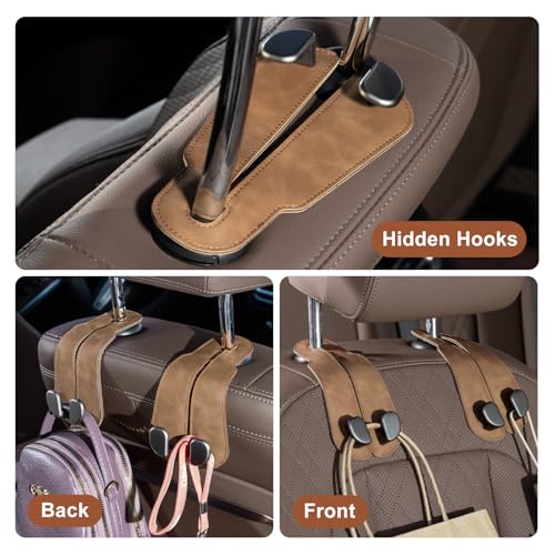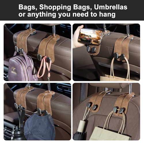 CoBak Purse Hook for Car – Universal Premium Stitched Leather and Aluminum-Magnesium Alloy Double Car Seat Back Storage Hook for Purses, Handbags, Bags (2 Pack),Brown