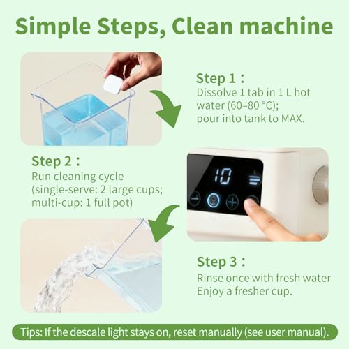Simple Cleaning Steps: Place one coffee maker cleaner tablet in the water tank, run a brew or cleaning cycle, then rinse with fresh water. Regular use keeps your coffee machine clean and reliable