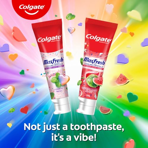 Colgate MaxFresh Rainbow Fresh Gel Toothpaste, with Heart Shaped Cooling Crystals, Triple Mint Flavour, and Ultrafreeze Technology for Intense Freshness, Vegan, Gluten-Free 100g/3.5oz