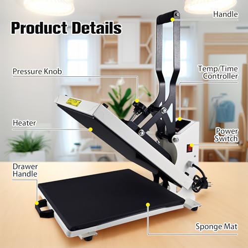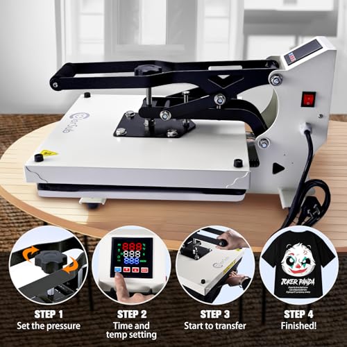 [Easy to Use] Handle on bottom plate for extra support and control. Easily and comfortably better control the desired pressure with the full range of pressure adjustment knob. The heat press can easily transfer htv, sublimation paper, DTF of colorful pictures and characters onto textiles, such as cotton, polyester and more fabric.