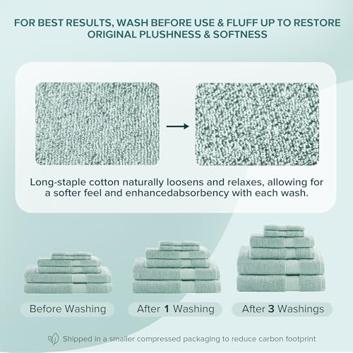 Seafoam Green Towel Set includes: 2 Bath Towels:27″W x 54″L, 2 Hand Towels:16″W x 30″L, 2 Wash Towels:12″W x 12″L. Items may arrive in compact packaging to reduce carbon footprint. Washing before first use is recommended to restore fluff and softness