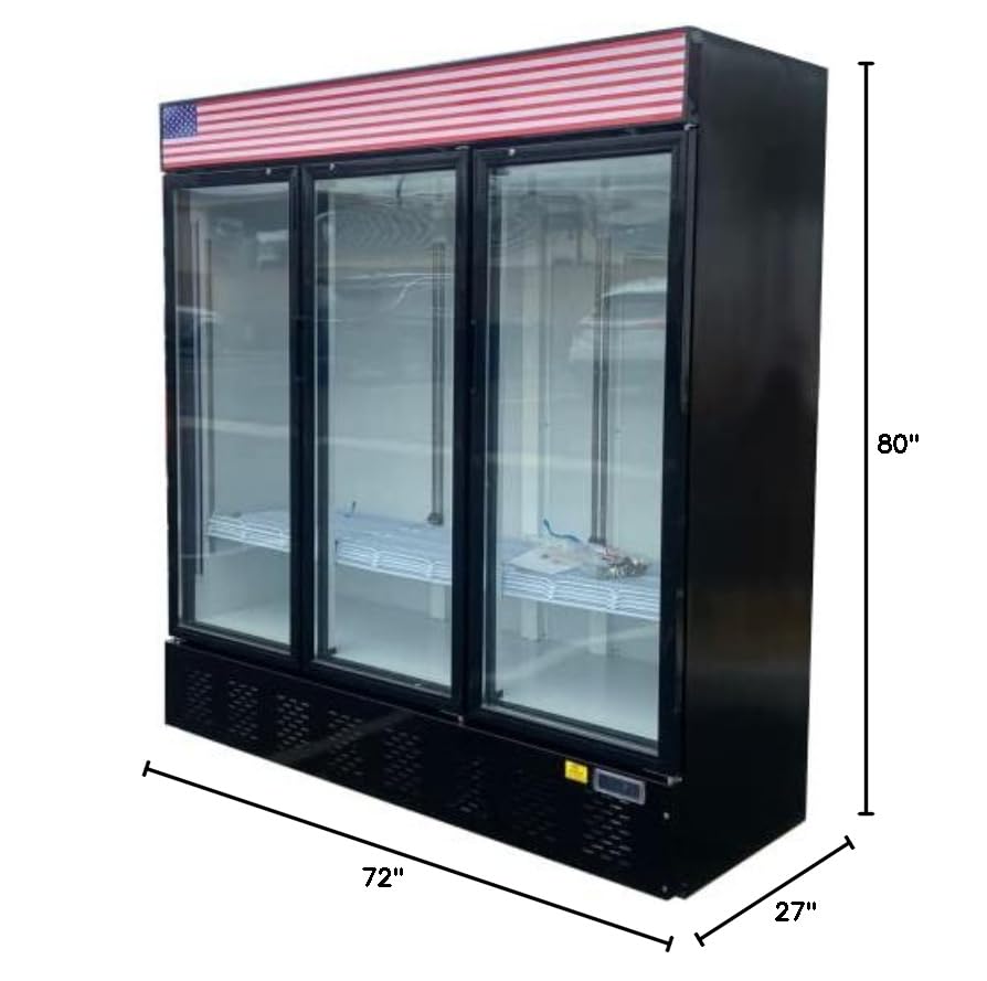 【Phone Number】Please double check your Phone Number when placing the order, make sure your phone is Reachable! This NSF Certified Three Glass door commercial Display refrigerator has a dimensions of 74 in Length X 26 in Depth X 80 Height, Its capacity is about 69 Cu.ft. Crafted with high quality temperature insulation material, this item will keep all your kitchen ingredients cooler and fresher. The led lights included will help you keep track of inventory easily.