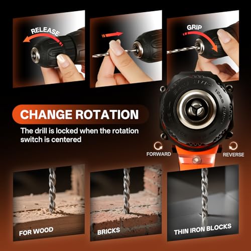 【20V POWER DRILL & 2.0 Ah BATTERY】 The 20V cordless power drill is powered by a 2.0Ah high-capacity lithium ion battery for longer working hours. A 2.5-hour charger is included. The electric drill features 3/8″ (10mm) keyless chuck and 25+1 torque setting with max 266 in-lbs torque. It holds the bits tight without falling off. 2 variable speed (0-350RPM and 0-1300RPM) allows you to easily control the drilling speed.