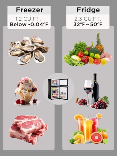 Spacious 3.5 Cu.Ft Capacity: With 1.2 cu.ft in the freezer and 2.3 cu.ft in the fridge, this mini refrigerator offers ample space for all your favorite snacks, beverages, and frozen treats. Keep everything organized and within reach for your busy lifestyle.