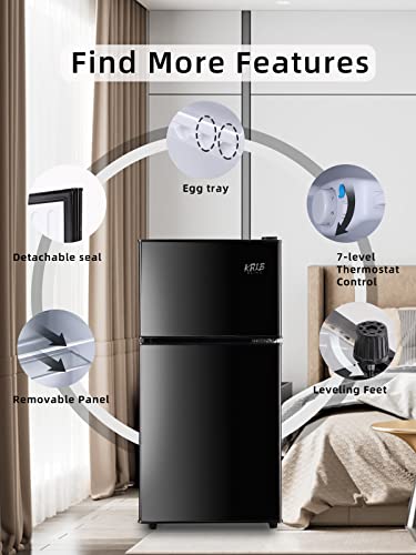 Two door design: This compact refrigerator has a large capacity of 3.5 cu.ft with its specific dual door design. Among the capacity, 2.3 cu.ft is for fresh food, you could keep foods organized and 1.2 cu.ft is for freezer, you could store frozen foods. Also the adjustable leveling feet can provide convenience while moving this small fridge.