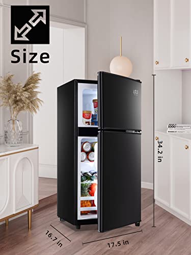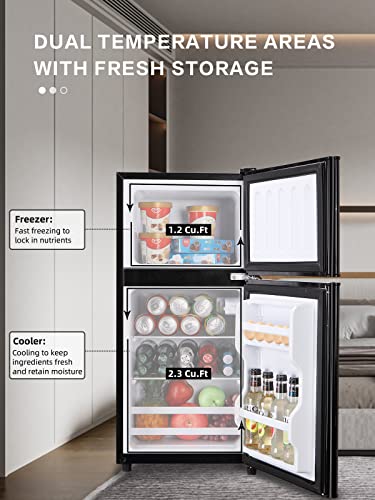 Freezer on top: The large capacity of 3.5 Cu.ft is divided into refrigerator and freezer areas, and these two areas could keep food in a fresh condition. The stylish two-door design is very suitable for dormitories, offices, bedrooms and apartments.
