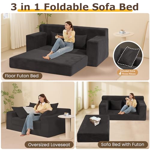Convertible Sofa Bed, 3 in 1 Loveseat Folding Couch Bed Foldable – Chaise Lounge Chair & Floor Futon Sleeper, Corduroy Pull Out Sofa Bed with 4 Pillows for Living Room, Black