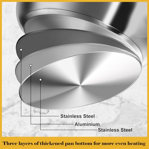 【Perfect Heat】Watch ingredients sizzle evenly in your pot—that perfect cooking scene. The secret? Our Tri-Base with an aluminum core. It heats fast and spreads heat uniformly. Made of high-quality stainless steel, this cookware set is tough enough to resist warping under high heat. It handles leaping gas flames or precise induction cooktops with steady performance
