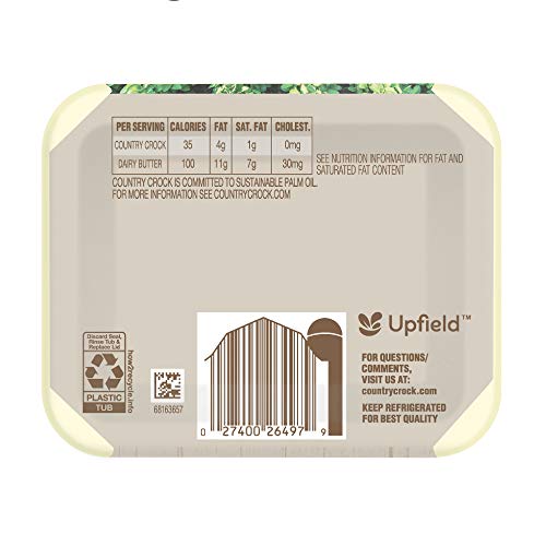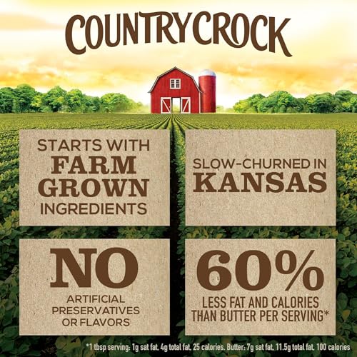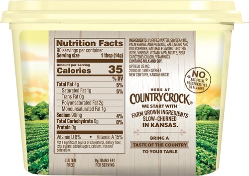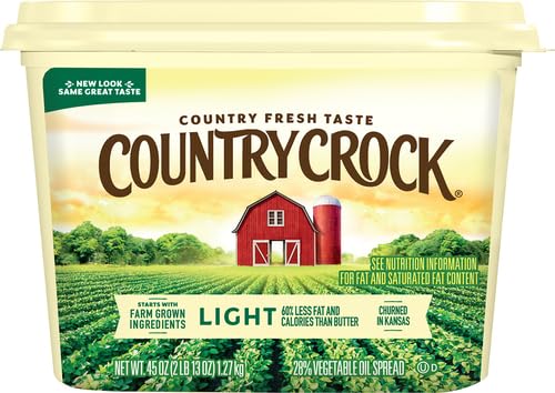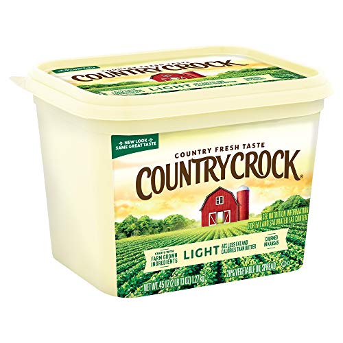 Country Crock Light gives you all the rich, creamy flavor you love, but with 35 calories per serving. Made from a perfect blend of oils, purified water and a pinch of salt, it’s a better for you alternative with no artificial flavors or preservatives, and no hydrogenated oils. Just simple ingredients you can recognize and pronounce. This spread also contains 0 grams trans-fat per serving*, 35 calories per one tablespoon, and 86% less saturated fat than butter.** It is also free of gluten, cholesterol, and comes in a 45 oz tub. *Contains 5 grams fat and 1 grams saturated fat per serving and is a good source of omega-3 ALA and omega 6-LA **Country Crock Light has 86% less saturated fat than traditional butter