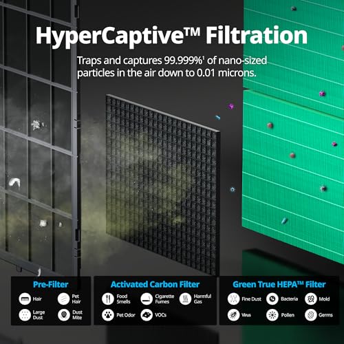 True HEPA filter captures and reduces up to 99.99% of 0.01-micron particles in the air.